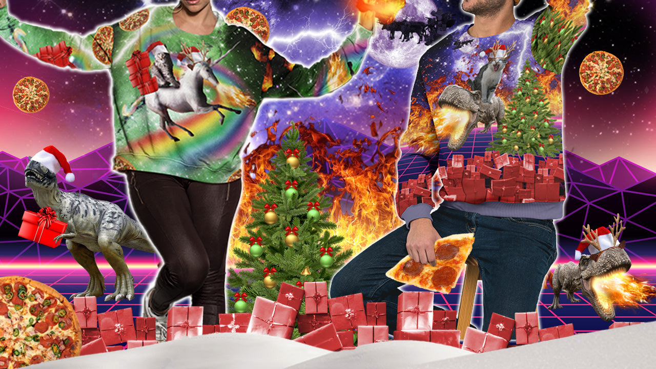 Cat Riding Dinosaur Ugly Christmas Sweater