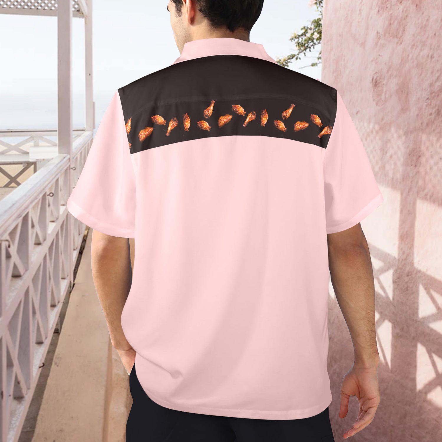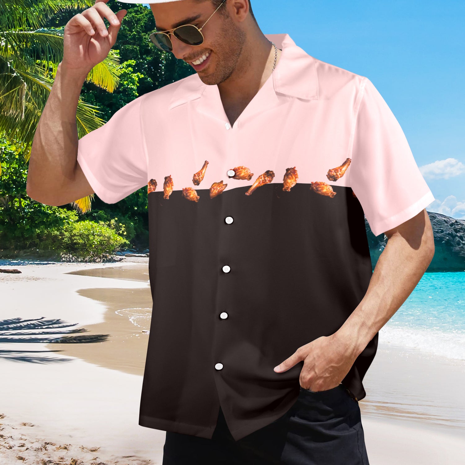 Dive into island vibes with a twist—this button-up Hawaiian shirt features a playful chicken wing print that's equal parts retro and ridiculous. Perfect for beach days, casual hangouts, or anyone who appreciates food-themed fashion with a sense of humor. Lightweight, breathable fabric keeps you cool while the bold design sparks conversations. A giftable statement piece for novelty lovers and pop culture enthusiasts.